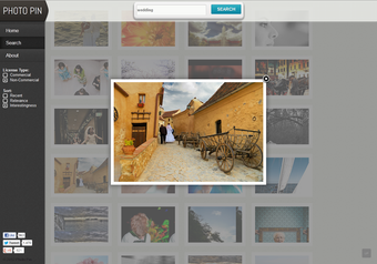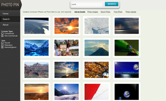 PHOTO PINは、商用もしくは非商用で転載可能な写真をダウンロードできるWebサービスです。キーワードを入れるだけで大手写真共有サイト「flickr」と「creative commons」にアップされている写真を横断検索し、結果を一覧で表示してくれます。今まで自分のブログやHPに使うためあちこちの無料写真サイトを探し回っていたという人にはとても便利なサービスです。