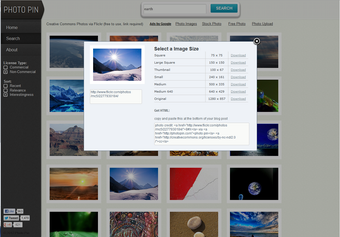 PHOTO PINは転載可能な写真を検索しダウンロードできるWebサービスです。埋め込み用HTMLコードなどもまとめて表示されるので、今まで写真探しに苦労していたという人は一見してみてはいかがでしょうか。